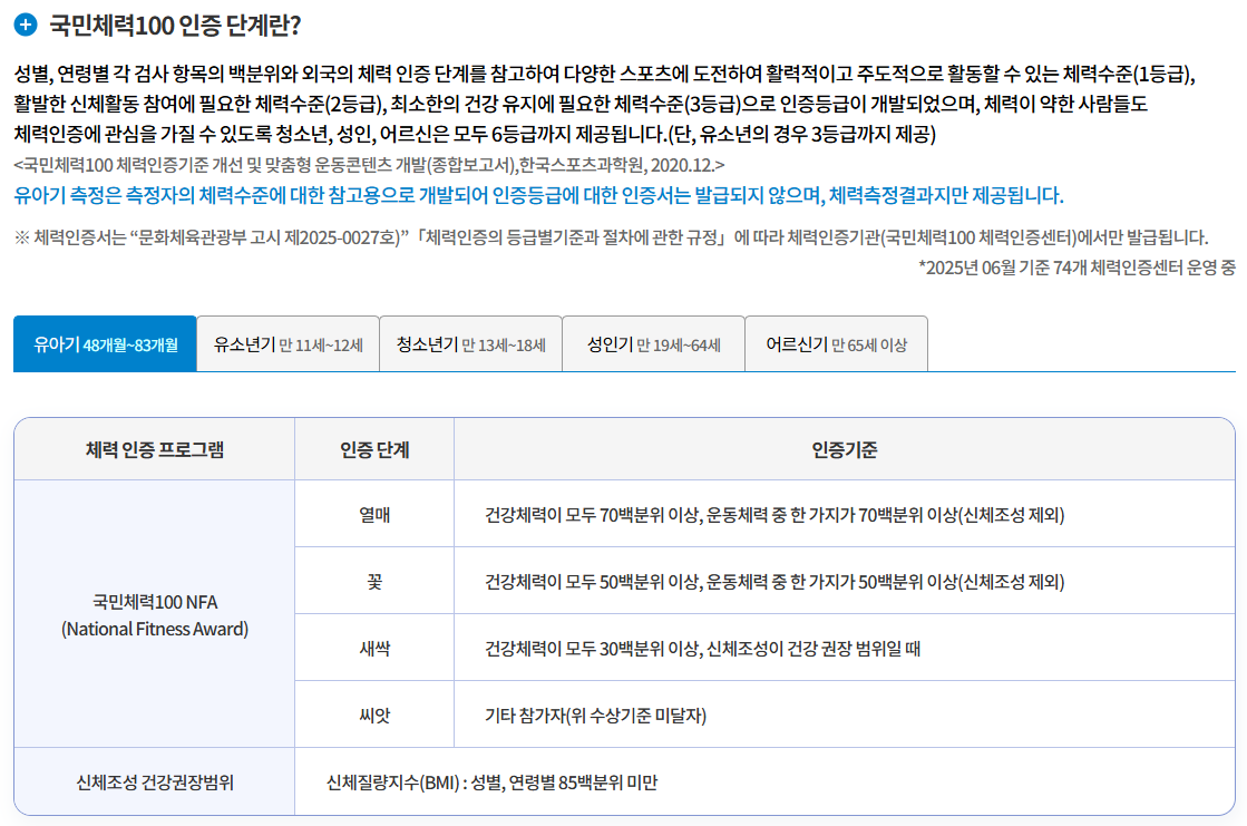 국민체력 100 프로그램은 문화체육관광부와 대한체육회가 주관하는 국가 공인 체력 관리 서비스입니다. 전국 75개소의 국민체력인증센터에서 무료로 이용할 수 있으며, 전문 장비와 전문가의 상담을 통해 개인별 체력 상태를 정밀하게 진단받을 수 있습니다. 기존에는 체력 인증 등급이 3단계로 나뉘어 있었으나, 2025년 6월부터는 성인, 청소년, 노인별로 세분화된 6단계 등급체계가 도입되어 보다 정확한 체력 진단이 가능해졌습니다. 이로 인해 나이와 성별, 체질에 맞는 더욱 세밀한 평가가 이루어집니다. 특히, 체지방률과 체질량지수(BMI) 기준도 대한비만학회 권고 기준을 반영하여 신뢰도를 한층 높였습니다. 이제 누구나 신분증만 지참하면 체계적인 체력 진단과 맞춤형 운동 지도를 받을 수 있습니다.