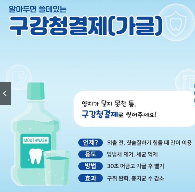 구강청결제(가글)는 양치질로도 닿지 않는 깊은 틈까지 세균을 억제합니다. 외출 전, 식사 후, 칫솔질이 어려울 때 간편하게 사용할 수 있어 실용성이 높습니다.