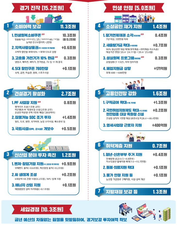 정부는 서민 생활 안정을 위해 5조 원을 편성했습니다. 특히 140만 명의 취약차주를 위한 ‘채무조정 패키지’가 핵심입니다. 연체 7년 이상, 5천만 원 이하 장기 채권을 소각하고, 저소득층 채무 감면도 새롭게 포함됐습니다. 또한, 성실히 정책자금을 상환하던 소상공인에게는 분할상환 유예 및 이자 감면 혜택이 제공됩니다. 고용안전망 강화도 포함됩니다. 구직급여 및 국민취업지원제도 확대로 총 24만 5천 명이 신규 지원을 받게 됩니다. 여기에 무주택 청년·신혼부부를 위한 공공임대 3,000호 공급, 긴급복지 2만 가구 확대, 농축산물 가공원료 구입비 지원까지 포함돼 있어 민생 회복에 실질적 보탬이 될 것으로 보입니다.