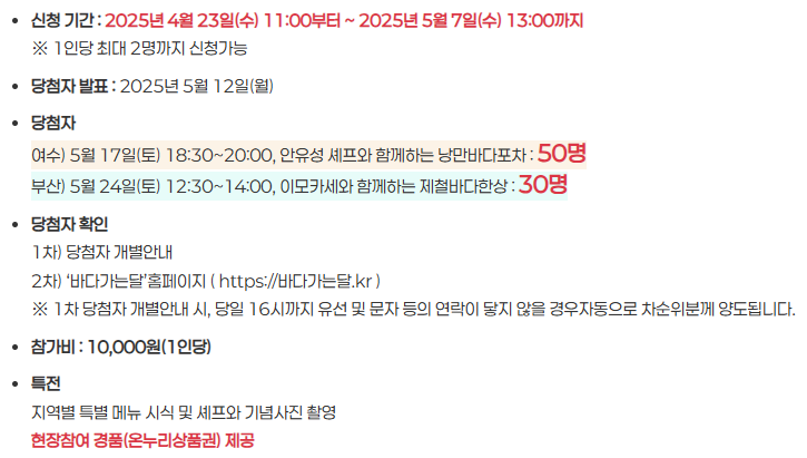 해양관광의 매력은 단지 풍경에 그치지 않습니다. 여수와 부산에서는 특별한 미식 행사인 ‘셰프의 바다밥상’이 열리는데요. 인기 셰프들이 지역 특산물을 활용해 특별한 바다 요리를 선보이며, 바다와 식탁이 하나로 연결되는 색다른 경험을 제공합니다. 이 행사는 단순히 음식을 먹는 자리가 아니라, 지역 농·수산물의 가치와 해양도시의 매력을 체감하는 기회입니다. 캠페인 홈페이지를 통해 ‘나만의 바다 여행 이야기’를 응모하면 현장 초청의 기회도 주어진다고 하니 참여해볼 만한 가치가 충분하겠죠?